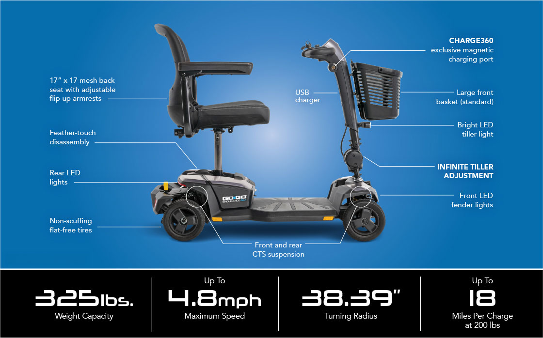 Supported by a lightweight aluminum frame, the Go Go® Endurance AL+ is a modern travel mobility scooter! Powered by a lithium battery, you can make tight turns with EZ Turn technology and recharge magnetically with Charge360. Other premium features such as CTS Suspension, an infinite tiller adjustment, and feather-touch disassembly make for a first-class mobility experience!